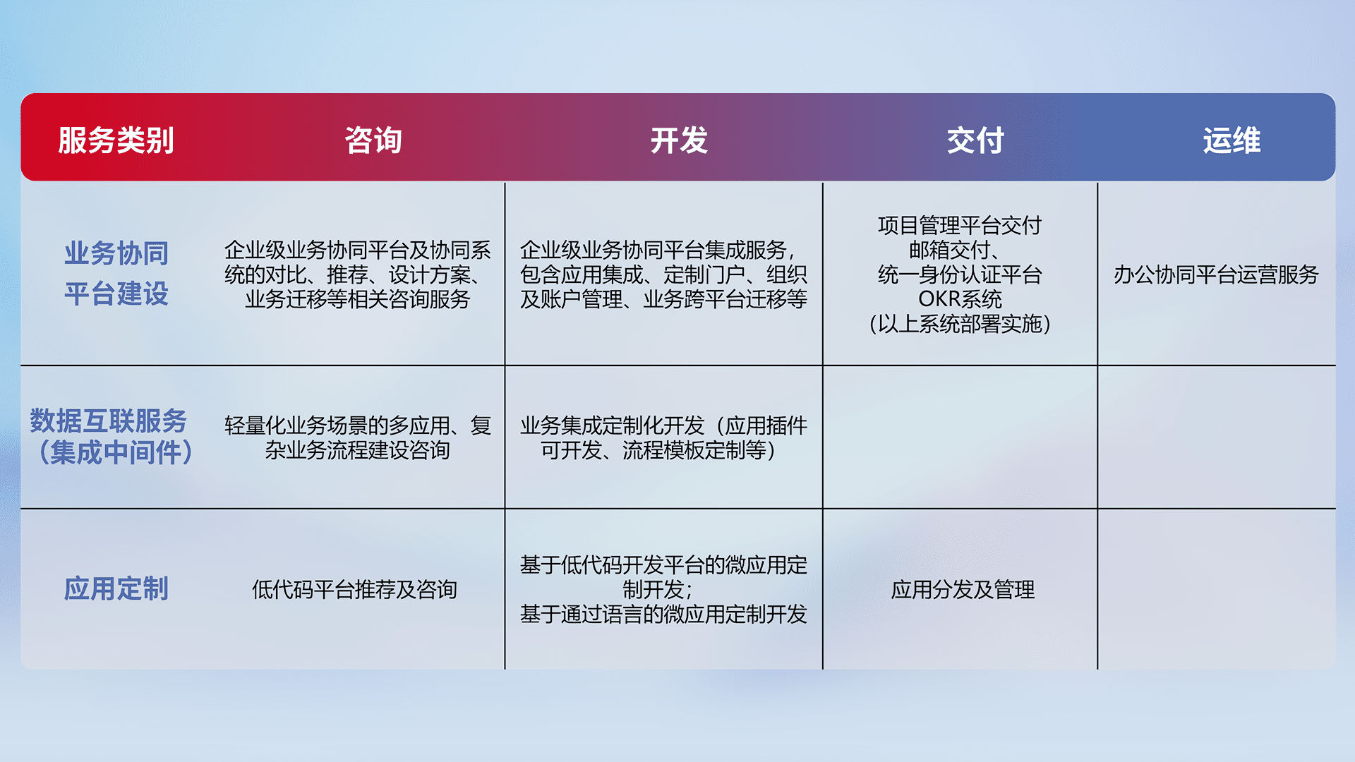 针对钉钉、、企微、、IDaas等平台级产品提供产品的规划、、、、方案、、、交付、、、定制化开发等服务,,,,实现如统一协同办公、、、智能客户服务、、、混合会议管理、、智能数据查询、、、等业务场景,,,实现数字化转型。。。